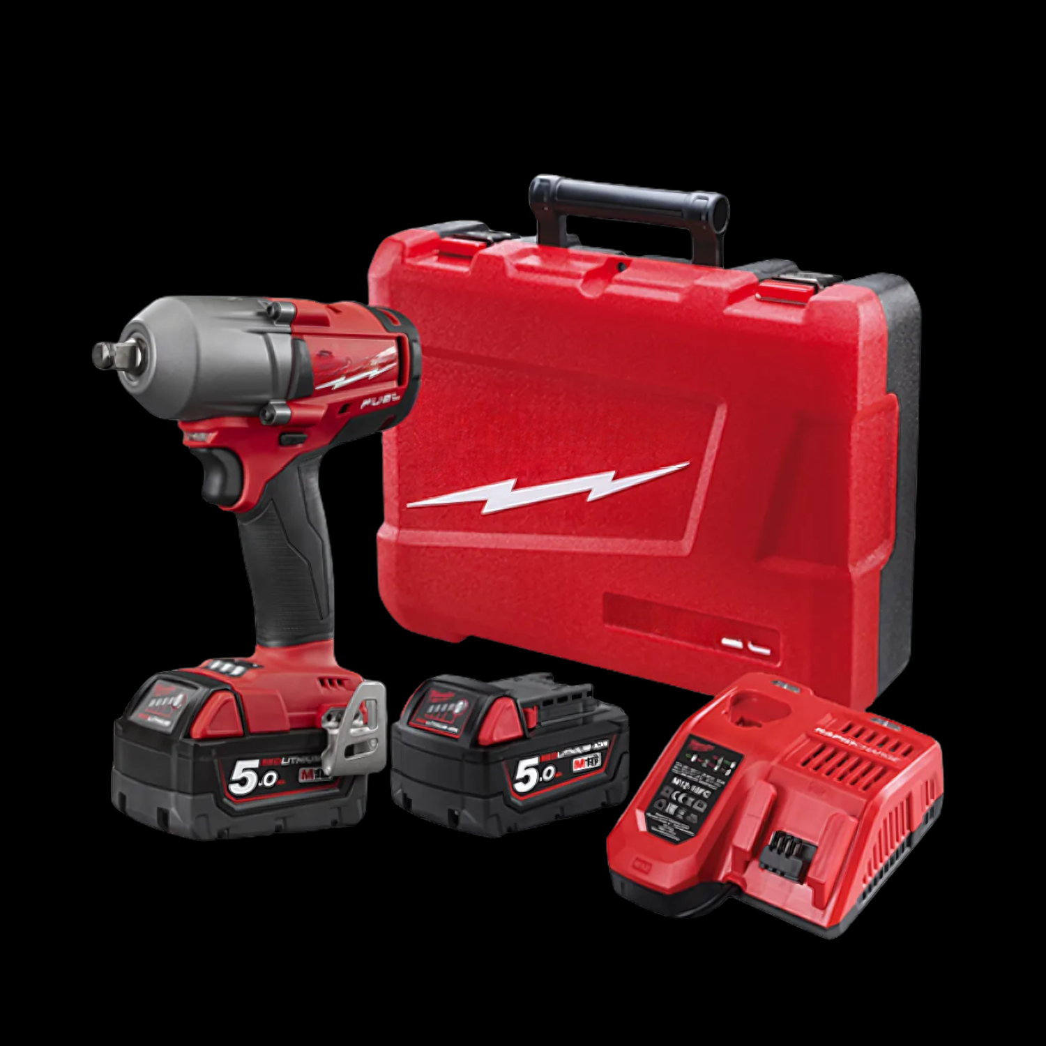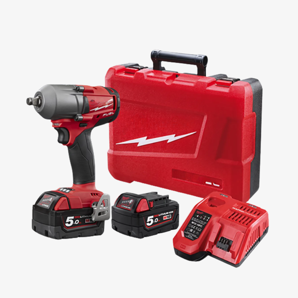 W komplecie otrzymujesz: klucz udarowy, 2 akumulatory 18V 5.0Ah, szybką ładowarkę, wytrzymałą walizkę transportową oraz zestaw nasadek udarowych w różnych rozmiarach.